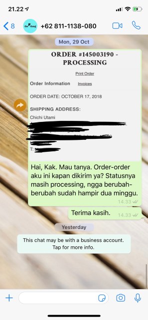 10 hari kemudian. Eeeeeng… kok pesanan saya belum datang-datang ya?Β Setelah diskusi dengan team Clozette ID Dan menghubungi pihak The F Thing lewat nomor whatsapp yang kemarin menghubungi saya, saya menanyakan orderan saya yang ngga sampe-sampe itu. Tapi ngga ditanggapi oleh pihak The F Thing.